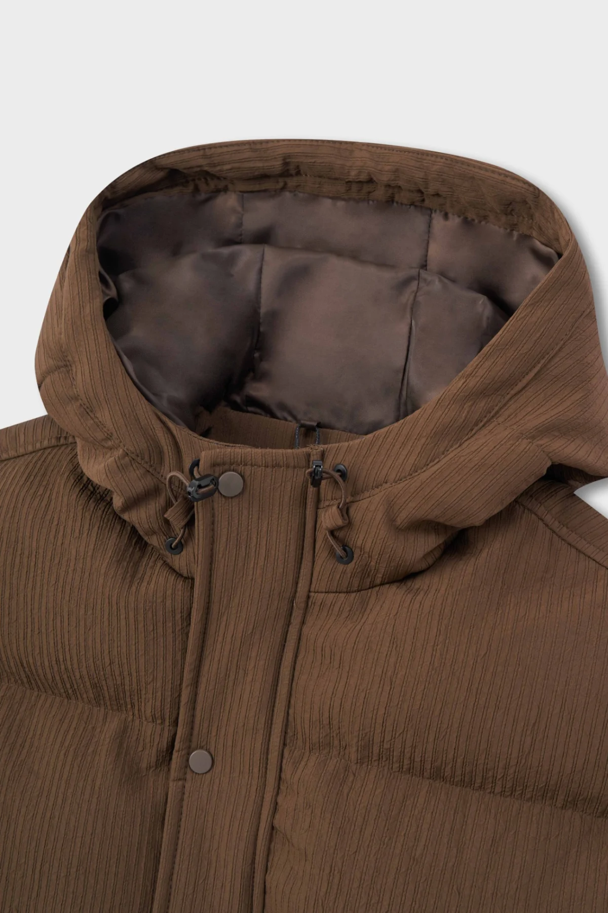 Phần mũ liền thân tăng thêm sự tiện dụng, vừa che chắn gió lạnh hiệu quả khi di chuyển ngoài trời, vừa tạo điểm nhấn hiện đại cho tổng thể trang phục.