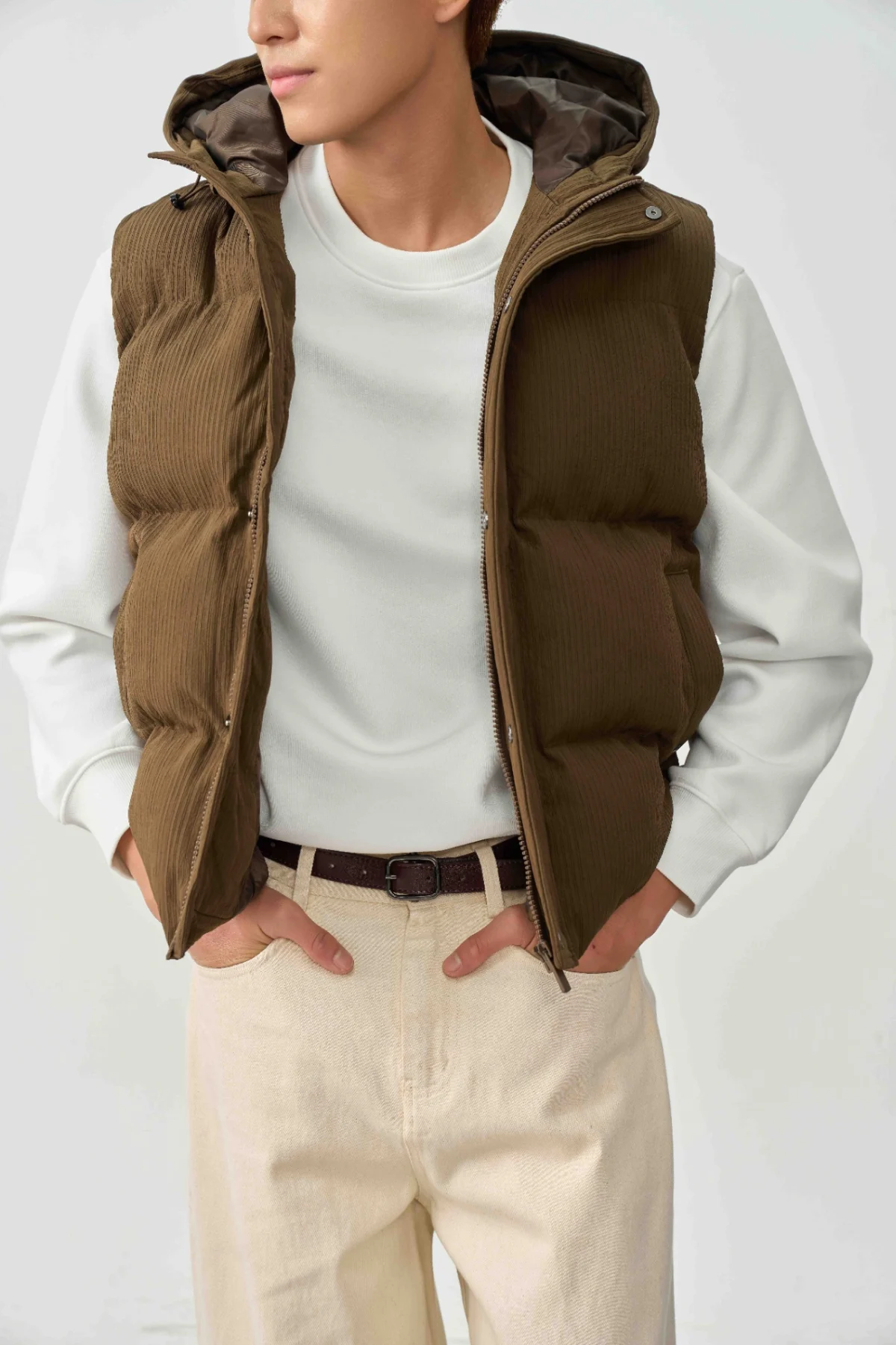 Với phom regular gọn gàng, chiếc gile dễ dàng phối hợp với nhiều kiểu trang phục: áo nỉ, áo thun dài tay hay áo len. Thiết kế tối giản nhưng tinh tế giúp bạn định hình phong cách từ trẻ trung, năng động đến thanh lịch, tùy cách phối đồ.